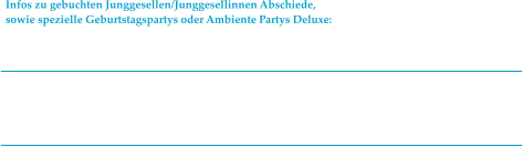Infos zu gebuchten Junggesellen/Junggesellinnen Abschiede,sowie spezielle Geburtstagspartys oder Ambiente Partys Deluxe:Selbstverständlich wird deine private Buchung niemals unterangekündigte oder vergangene Event‘s aufgelistet werden!Diskretion ist bei privater Buchung das oberste Gebot von EventDragon. Dein Vertrauen in unseren professionellenUmgang mit deiner Anfrage und anschließender Umsetzung ist unser Unternehmens-Prinzip!